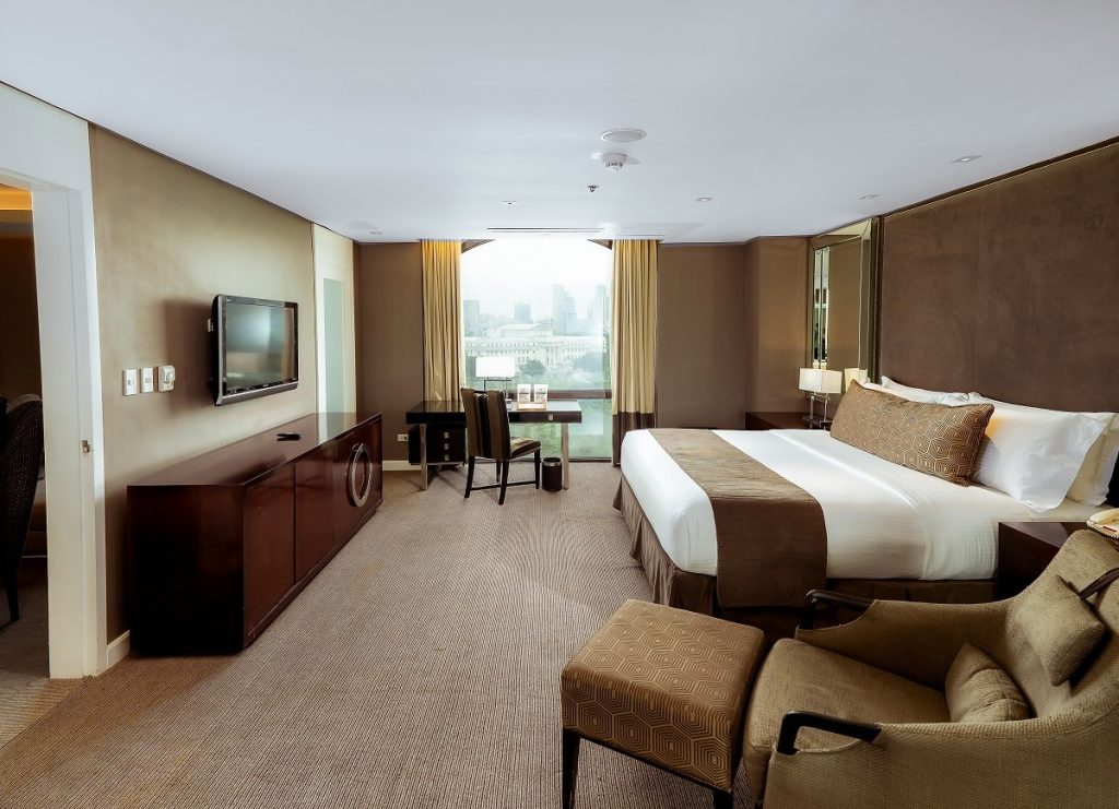「ザ マニラ ホテル」には全515室のお部屋があります。メインビルとタワーウィングに分かれています。このホテルに泊まる際は、スイートルームがおすすめです。比較的泊まりやすいお値段で、眺望はベイビュー、パークビュー、サンライズビューなど様々で、お好みに合わせてお選びいただけます。さらに、スイートルームに泊まるゲストは、マニラ湾が一望できるエグゼクティブラウンジを利用できるため、ラグジュアリーなホテルステイを楽しむのにぴったりです。館内には、美しい景色が広がる屋外プールやガーデン、レストラン、スパ、バーなど、多彩な施設が揃っています。